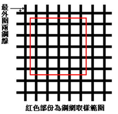 由於國內CNS規範並無說明熔接鋼線網成品檢驗頻率,故目前國內對於熔接鋼線網之檢驗頻率仍沿用美國ASTM-490b中規定,熔接前之線材每20噸作一次拉伸試驗,成品鋼網每6968㎡作一次拉伸試驗,每27870㎡作一次抗剪試驗,試驗用試品是由成品中剪切一片等寬之大片試片為之;取樣方式如上